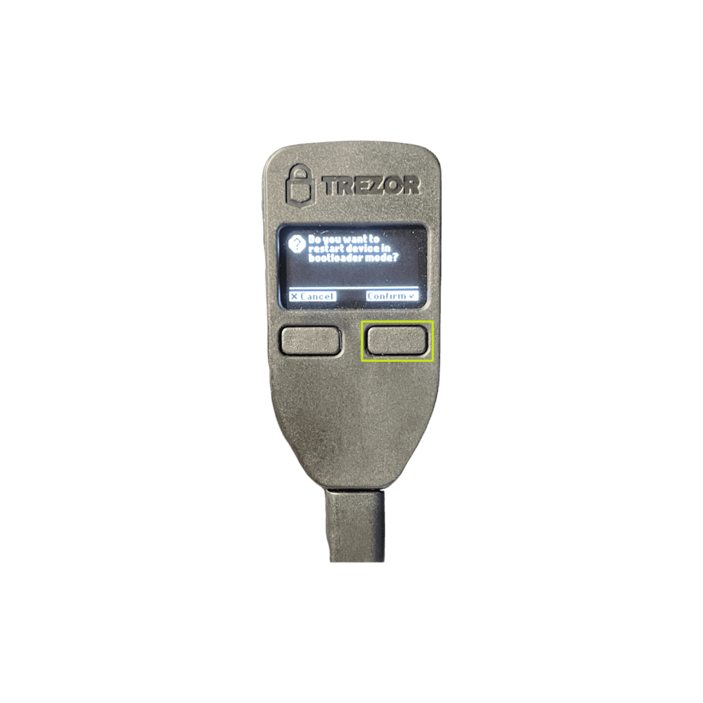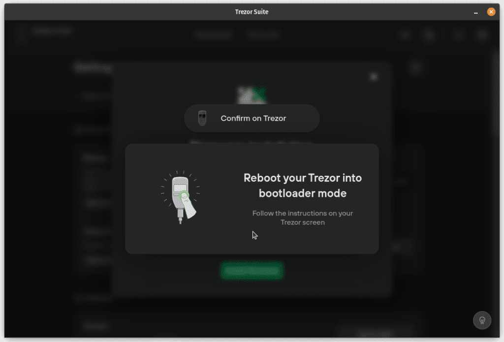 Once you click “Continue” verifying that you have your seed you should receive a notification to reboot your Trezor into bootloader mode by confirming on your Trezor by selecting the confirm option on your Trezor.