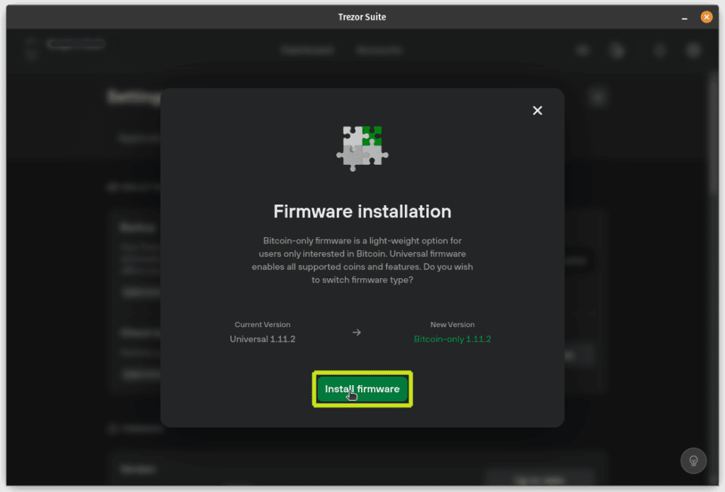 Once you click the “Switch to Bitcoin” button you will get a pop up window explaining what the Bitcoin only firmware is all about it will also show which firmware version you will be switching from and to, click the “Install firmware” button at this time.