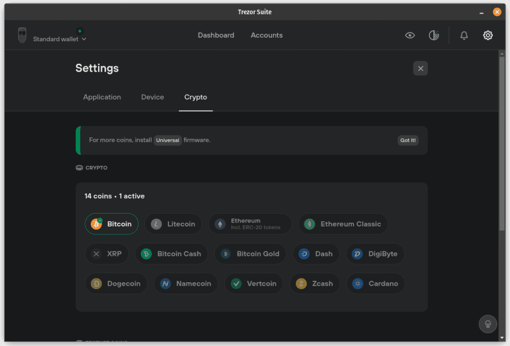 Your Trezor now should be loaded with the Bitcoin only firmware and should only be able to handle Bitcoin transactions. And under the Crypto tab in the Trezor Suite App you should see a line inviting you to install the “Universal” firmware to be able to have more coins available and Bitcoin should be the only active.