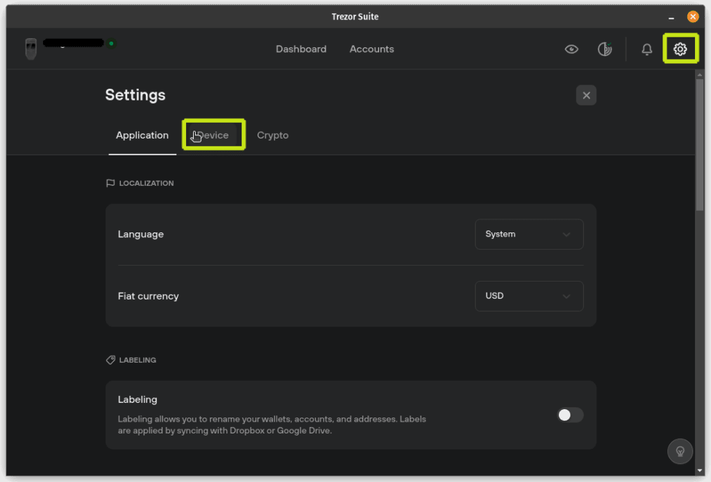 Open the Trezor Suite App, connect you Trezor to the app and navigate to “Settings” by clicking on the gear icon on the right upper corner, once in the “Settings” window click to select the “Device” tab.