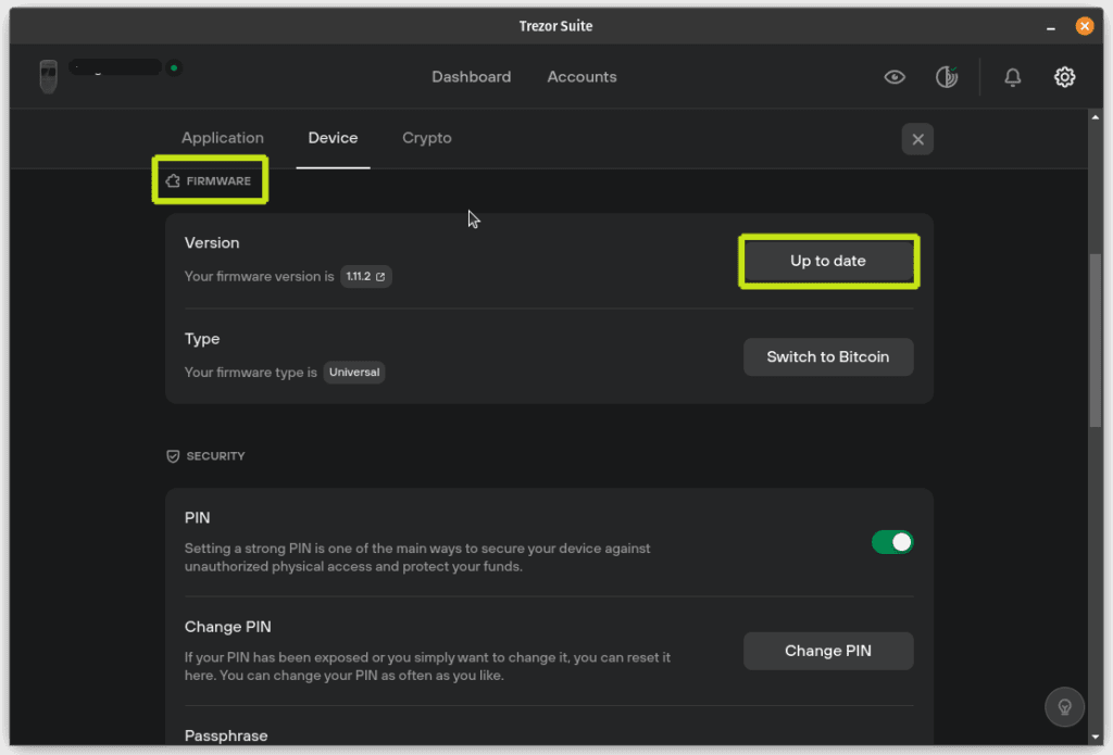 Once on the “Device” tab verify that your firmware is up to date if it is not update your device to the latest firmware available for it, in my case I am using a Trezor One and I was a few versions back once you have upgraded and “up to date” your button would be as below.