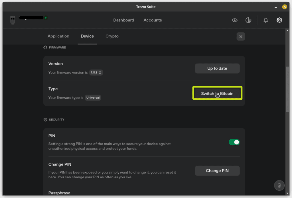 After having your device updated to the latest current firmware available for it and still connected to the Trezor Suite App you should see the “Switch to Bitcoin” button available to you. Go ahead and click that button to start.
