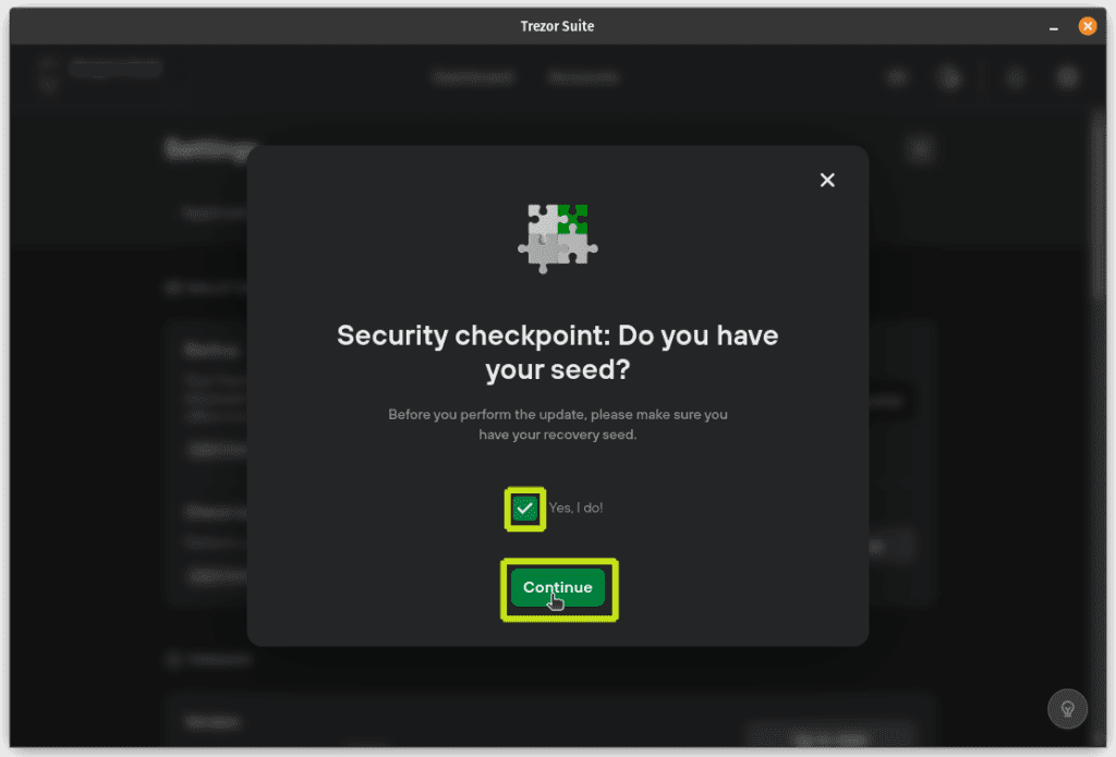After clicking “install firmware” button the pop up will change to a verification point to ensure that you have your seed and can use it if anything goes wrong and you need to restore your wallet, having your see available is very important every time you update your firmware.