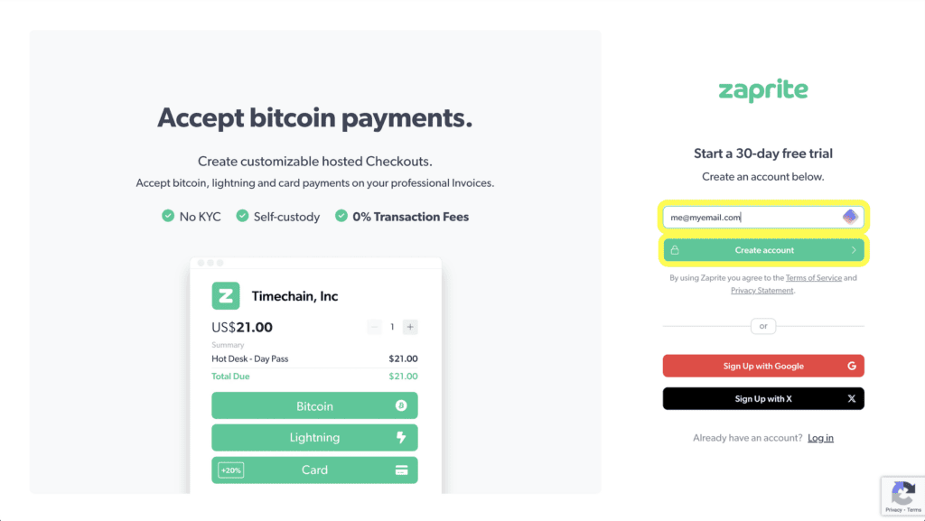 This will take you to https://app.zaprite.com to create an account simply enter your email and click create account or sign up using Google or X signins. In my case I used an email address.