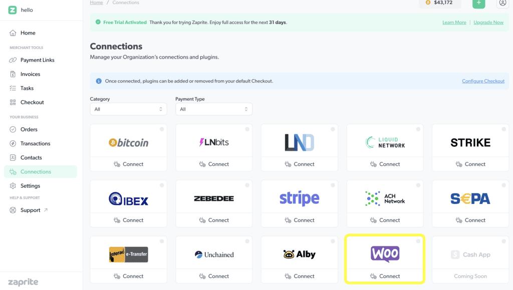 Clicking the connections link will take us to the main connections section here we will find all available connections that we could setup, we will start with Woo so that we can use Zaprite in our Woocommerce store in order to be able to accept payments in Bitcoin including lightning and also fiat.