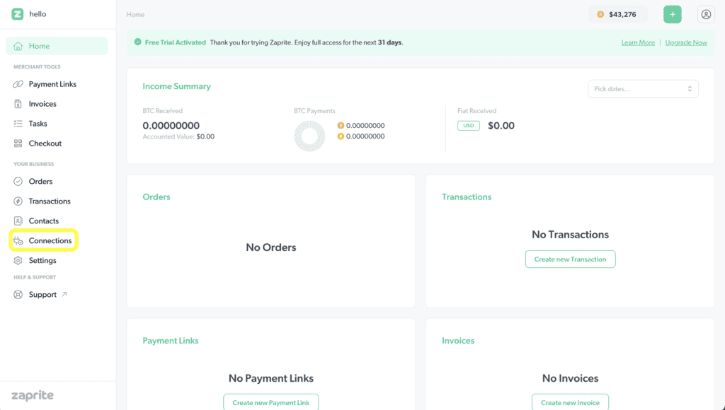 We are insterested in the connection section located on the left panel under “YOUR BUSINESS” section, click the connections link in order to start setting up our connections, from the connection page we are going to be using, Bitcoin, Stripe, Woo, and Strike, next we will go trought the setup for these services: