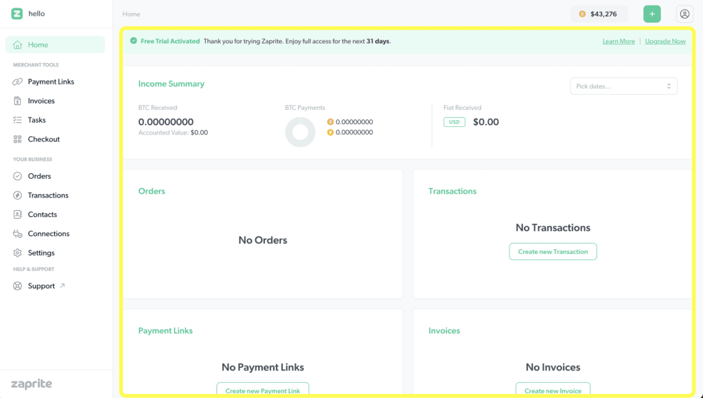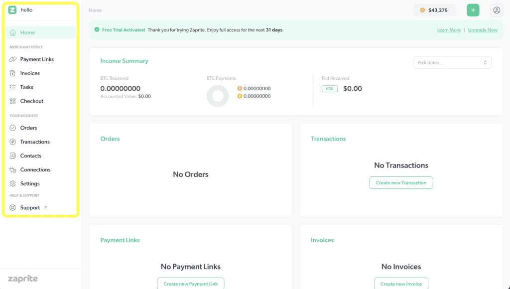 On the main panel of the dashboard you will find details like the plan you are in in this case is the free trial since we just created the account, your income summary in BTC or FIAT, orders, transactions, any payment links you may have created with the option to create one, any invoices you may have created also with the option to creat one, your tasks if you have any this also has the option to create on from here, to the right theres is your subscription details including when activated, last payment, next payment due etc., Market area which shows Bitcoin price in FIAT terms, price changes, how many sats per USD and the total market cap, it also has a section for Help and Support.
