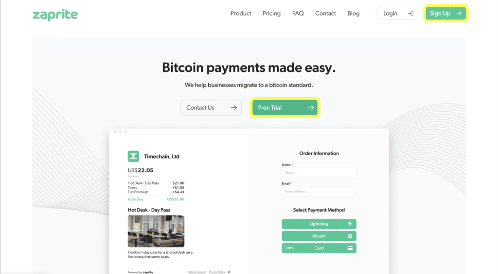 This is actually very easy with Zaprite, first head to their website at https://www.zaprite.com once there you have two options either click the green “sign up” button on the right upper corner or the green “free trial” button on the center of the page.