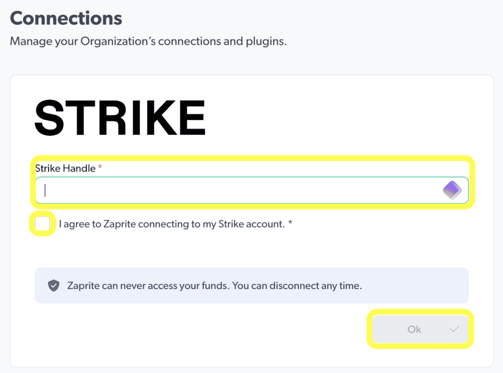 - Click to check mark I agree to Zaprite connecting to my Strike account. *