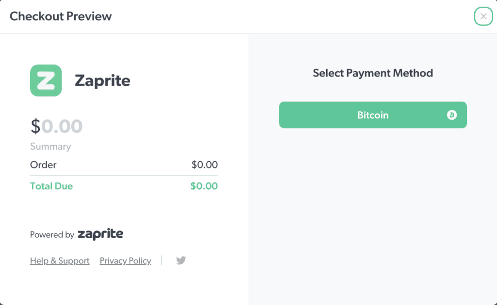 Below is a preview of how your Zaprite store check out will look in this case showing Bitcoin on chain as the payment method: