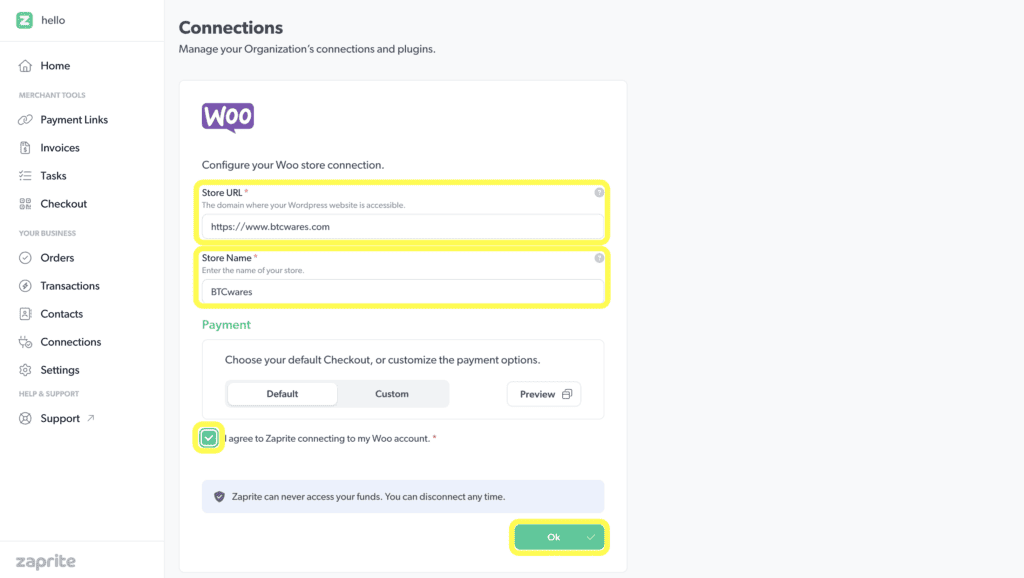 - Click the “I agree to Zaprite connecting to my Woo account *“