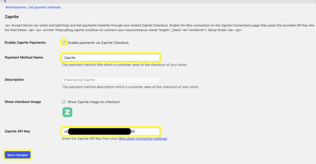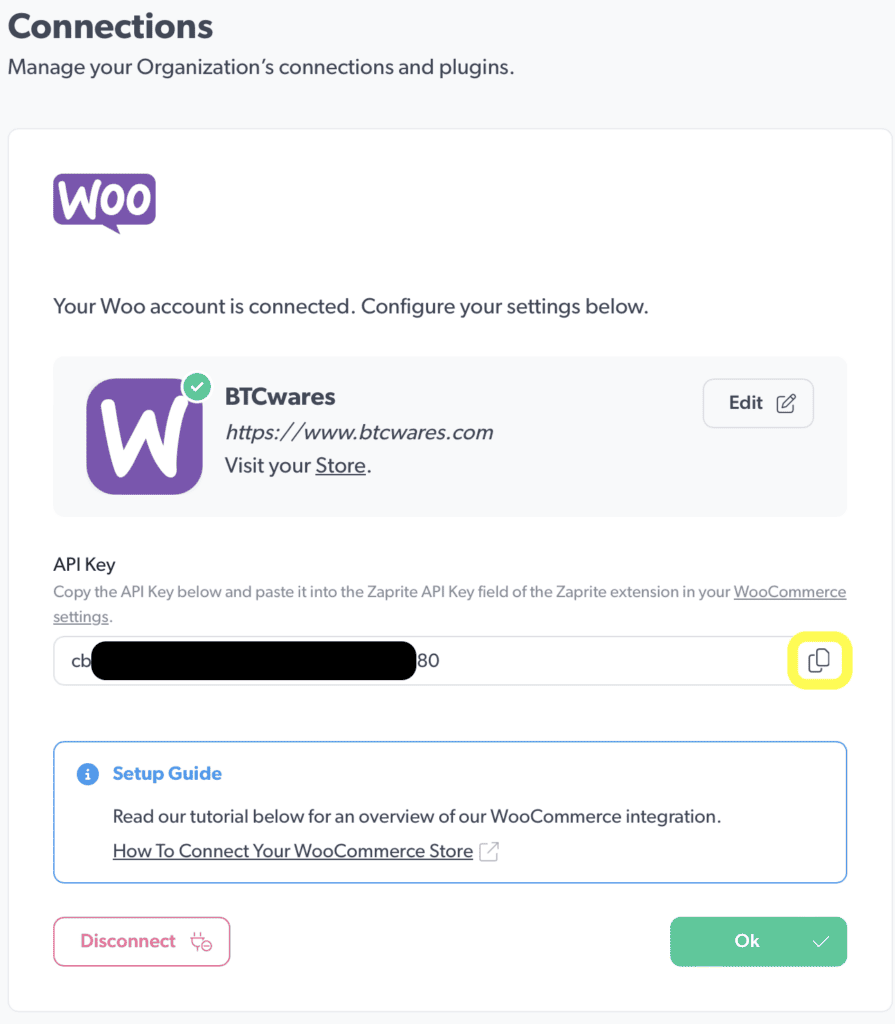 In order to activate Zaprite on your Woo store you need to go to your Zaprite connections page open the Woo settings page and copy the API key there.