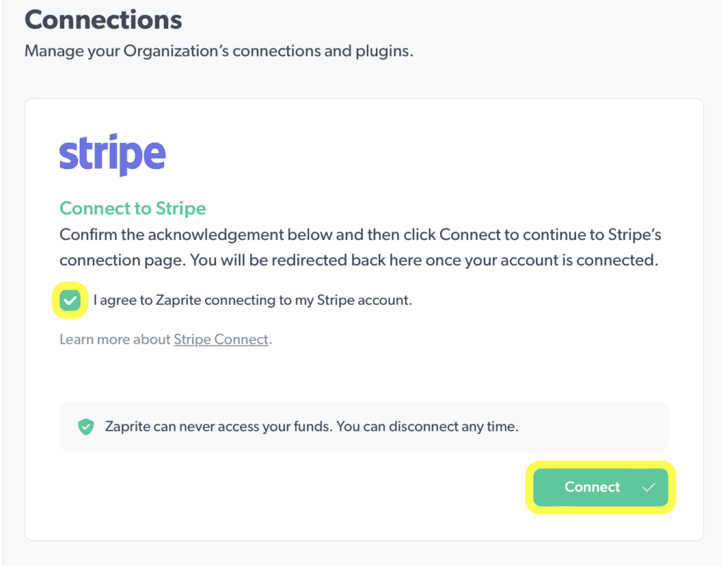 - Click to check mark I agree to Zaprite connecting to my Stripe account. and click Connect